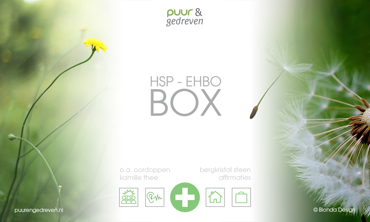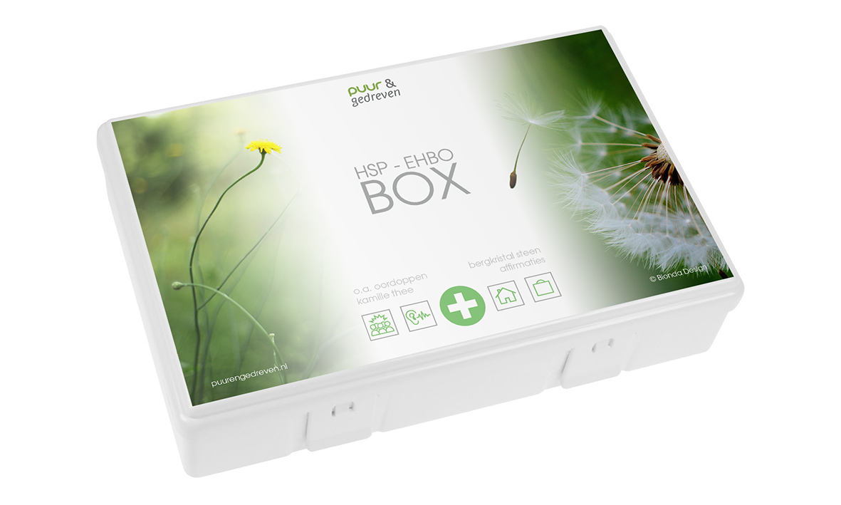 Packaging design for the Dutch company Puur en Gedreven. The product itself is a first aid kit for high sensitive persons (HSP).